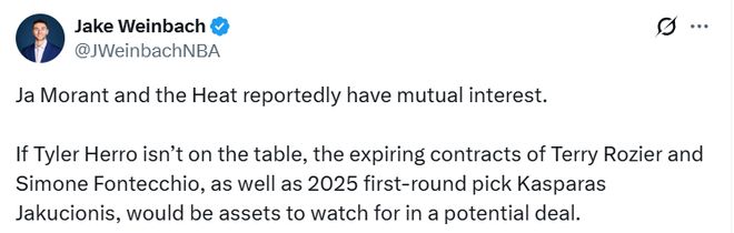 北京時(shí)間1月14日,據(jù)NBA記者Jake Weinbach報(bào)道,據(jù)報(bào)道,賈-莫蘭特與邁阿密熱火隊(duì)雙方互有興趣。若泰勒-希羅不被納入交易討論范圍,那麼羅齊爾和豐泰基奧的到期合同,以及2025年首輪秀亞庫(kù)西奧尼斯,將成為這筆潛在交易中值得關(guān)註的籌碼。