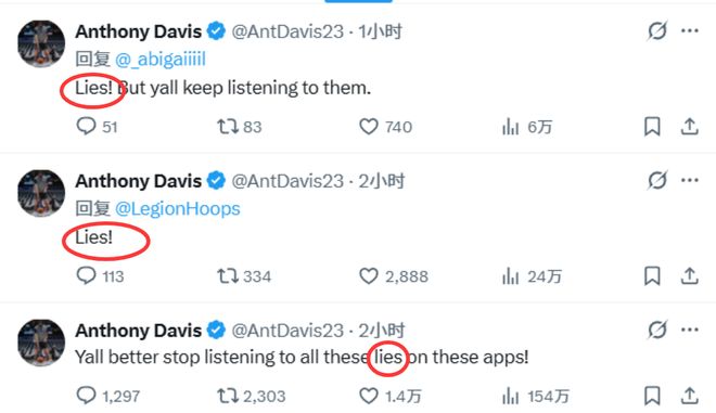 此前,名記Shams率先報道,戴維斯預計將接受左手韌帶修復手術,缺席賽場數月。戴維斯對Shams的報道予以否認,並通過社交媒體進行反駁。“大傢最好別再相信這些平臺上的謊言瞭。”戴維斯在社媒上寫道,隨後又在多條援引這一突發新聞的帖子下回復“謊言”二字。在今天將前往洛杉磯與手部專傢會面後,濃眉確定無需接受手術。Shams隨後也修正瞭自己的報道,不過未來六周,濃眉是肯定無法出場瞭。