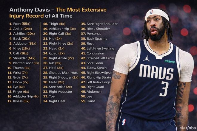 Garza表示:“戴維斯再度因左手嚴(yán)重傷勢(shì)缺陣……他職業(yè)生涯中被記錄在案的傷病已經(jīng)超過(guò)285次,這筆交易的風(fēng)險(xiǎn)從一開始就顯而易見。簡(jiǎn)單算筆賬就知道,14個(gè)NBA賽季裡出現(xiàn)285次傷病相關(guān)情況,平均每年超過(guò)20次。他最常見的傷病部位有哪些?腳部55次,腳踝24次,跟腱20次,背部20次?!?/p>