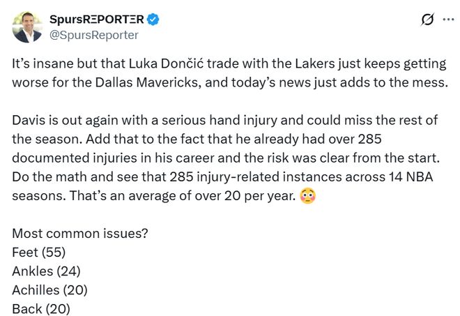 NBA記者Garza曬出瞭一張關(guān)於濃眉傷病歷史的圖,可謂是觸目驚心。Garza表示,離譜的是,當(dāng)初獨(dú)行俠與湖人關(guān)於東契奇的那筆交易,對(duì)達(dá)拉斯方面來(lái)說(shuō)局勢(shì)還在持續(xù)惡化,而今天的消息更是讓這攤渾水雪上加霜。