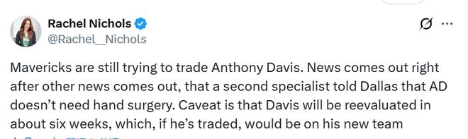 NBA記者Nichols表示,獨(dú)行俠仍在嘗試交易戴維斯。就在另一位專傢告知達(dá)拉斯,戴維斯的左手無(wú)需接受手術(shù)的消息傳出後不久,這一動(dòng)態(tài)隨即曝光。需要註意的是,戴維斯將在約六周後接受復(fù)查 —— 如果屆時(shí)他已被交易,這次復(fù)查就將由他的新球隊(duì)來(lái)安排。
