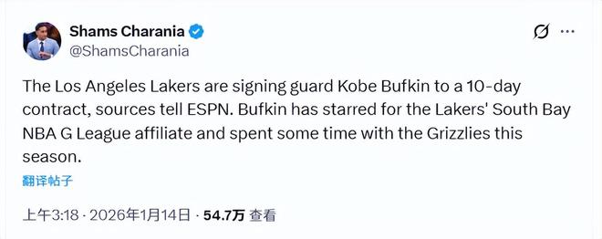 北京時間1月14日,據名記Shams報道,湖人已同意與後衛科比-巴夫金簽下一份10天短合同。巴夫金是2023年NBA選秀的首輪15號秀,職業生涯前兩個賽季效力於老鷹,休賽期被交易至籃網,隨後在2025-26賽季常規賽開打前被籃網方面裁掉。