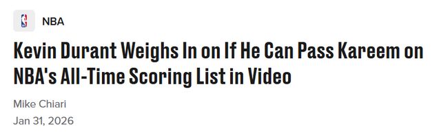 想要超越詹姆斯42821分的歷史總得分紀錄,看起來并不現實,但杜蘭特與賈巴爾38387分的紀錄之間的差距,處于更具可行性的追趕范圍內。