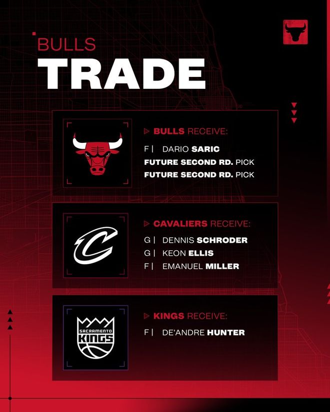 公牛得到:達(dá)里奧-薩里奇、2027年次輪簽、2029年次輪簽
