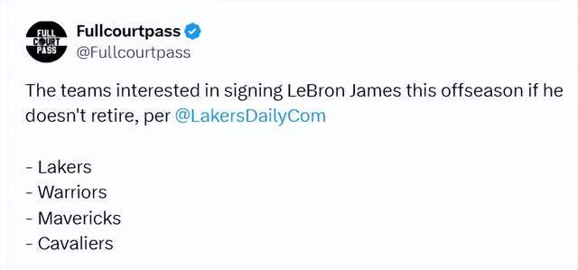 消息稱,詹姆斯的現東家洛杉磯湖人隊,以及金州勇士隊、達拉斯獨行俠隊、克利夫蘭騎士隊,均有意在休賽期簽下詹姆斯。