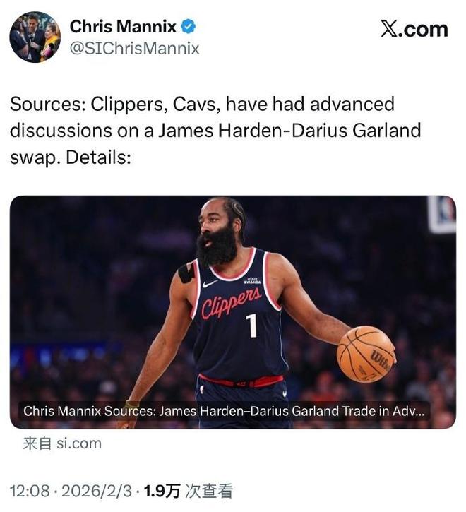 北京時間2月3日,當哈登連續(xù)兩場缺席快船比賽后,如今根據(jù)《體育畫報》名記Chris Mannix報道,多位消息人士透露騎士和快船已經(jīng)就一項交易進行深入討論,即討論用哈登去交易加蘭。OOS體育記者Rob Murrows跟進報道,除騎士之外,火箭也在認真考慮交易得到哈登,畢竟火箭在范喬丹受傷后急需升級后場。